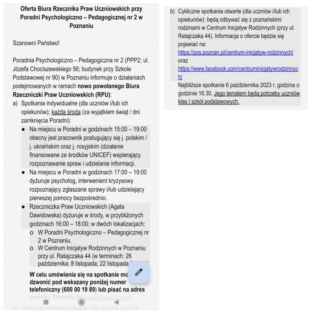 W sytuacji, kiedy mają Państwo potrzebę pomocy psychologicznej dla swoich dzieci np. w związku z zaburzeniami lękowo – emocjonalnymi, problemami wychowawczymi, problemami rodzinnymi, problemami wynikającymi z sytuacji pandemicznej, mogą się Państwo kontaktować każdego dnia pod wskazany powyżej numer telefonu lub e-mail. Poradnia jest otwarta również dla pełnoletnich uczniów.