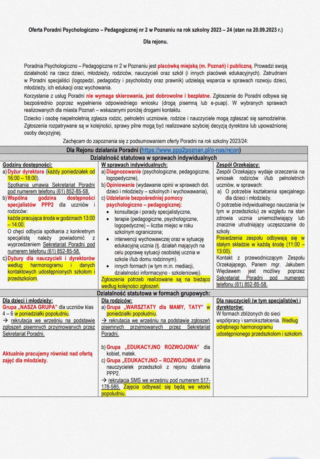 Informujemy, że placówka znajduje się w rejonie działania Poradni Psychologiczno-Pedagogicznej Nr 8, mającej swoją siedzibę na os. Rusa 56/D1 (w budynku Szkoły Podstawowej nr 6), kontakt tel. 61 67040 39, ppp8.poznan@wp.pl , www.ppp8-poznan.pl